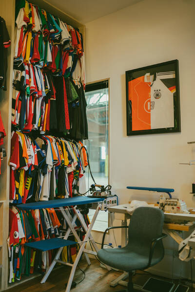We have our workshop in the North side of Amsterdam where we receive clients to make them bespoke shirts. At this venue you can buy ready mades as well as printed items.